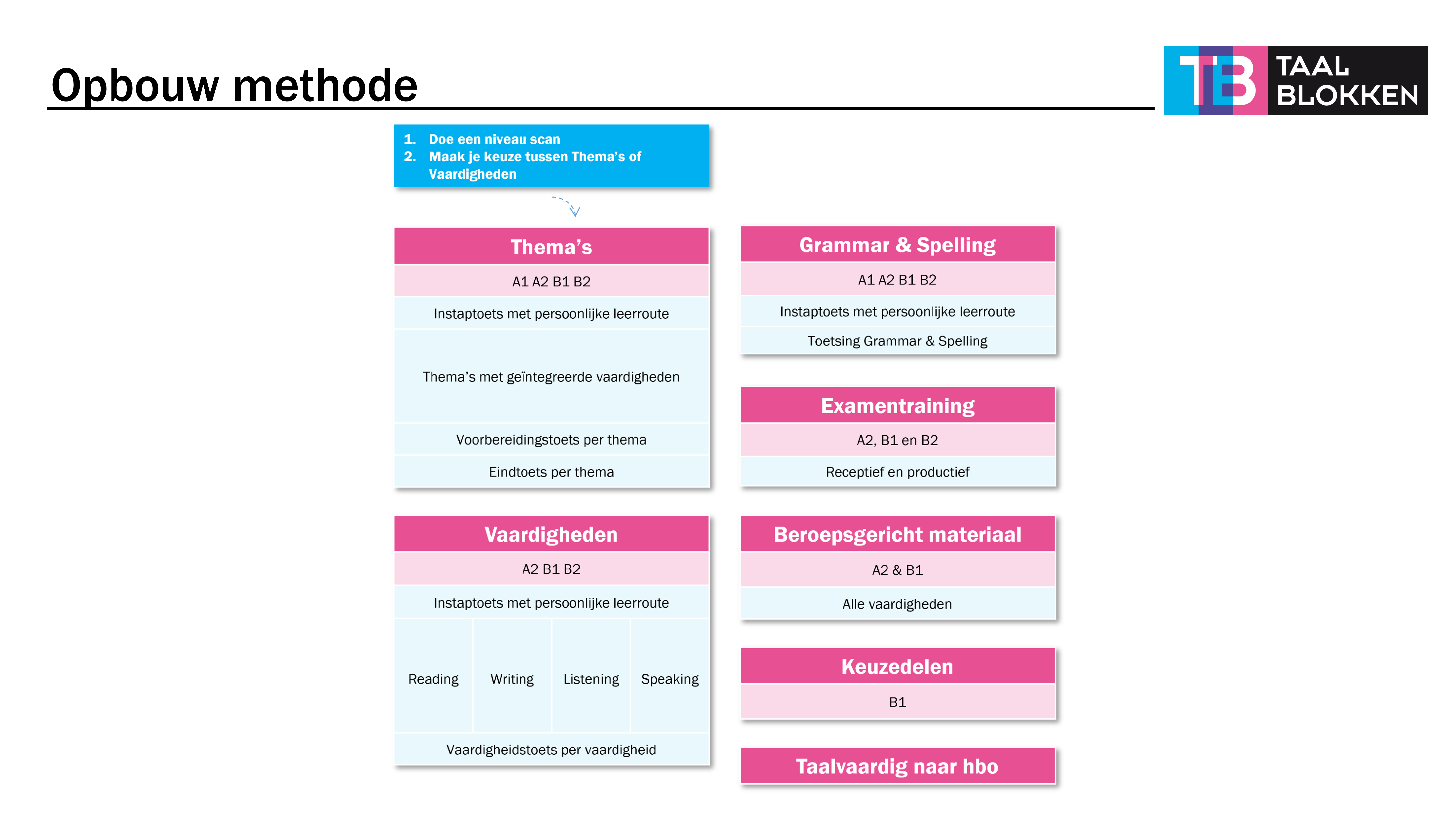 Taalblokken is er ook voor Nederlands en Duits. Voor meer informatie over deze methodes bekijk de methodepagina.